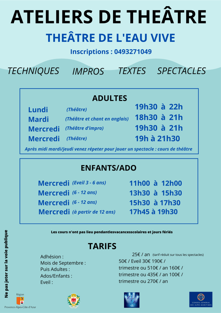 👉 Pour vous inscrire aux cours et stages de théâtre, envoyez un mail à l’adresse suivante : theatredeleauvive@gmail.com